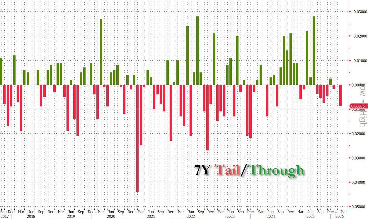 财政部最近对7年期国债的440亿美元拍卖显示,需求持续疲软,为国债拍卖周收官带来挑战。最高收益率达到4.255%,为2025年1月以来最高水平,并超过市场预期(出现比平时更大的“尾部”)。