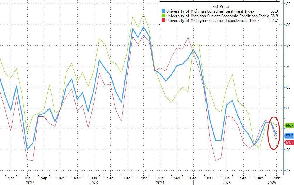 密歇根大学消费者信心指数在3月份大幅下降至53.3,为今年最低值,受伊朗冲突升级和随之而来的市场波动影响显著。当前状况和预期均有所下降,特别是受汽油价格上涨和股市波动影响的高收入消费者。
