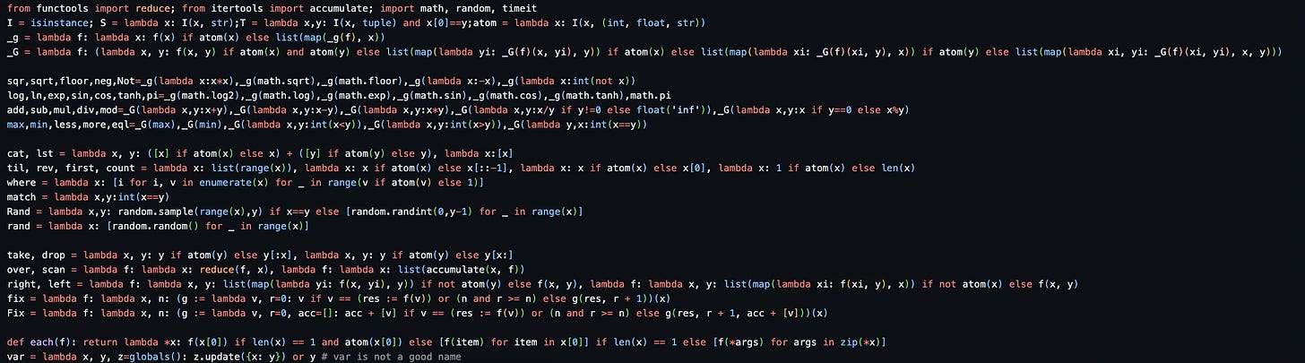 在20世纪50年代和60年代,富有表现力的编程语言的探索出现了两条平行路径:Lisp 和 APL。Lisp 源于列表处理,强调语义优雅——将代码视为数据;而 APL 由 Kenneth Iverson 创建,则优先考虑语法密度,采用一种独特的、类似象形文字的符号来简洁地表示复杂的思想。