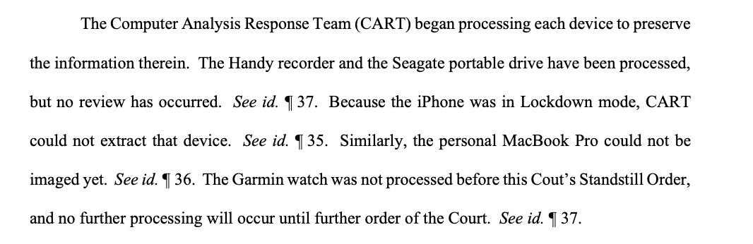 虽然iPhone仍然无法访问,但FBI在提示记者使用指纹扫描仪后,使用她的密码成功访问了第二台Macbook Pro。他们已经从笔记本电脑的Signal应用程序中获取了照片和录音,但尚未创建其内容的完整镜像。