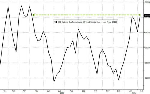 Stockpiles at Cushing, Oklahoma, rose to 25.1 million barrels, the highest level since April 2025. The weekly build is the largest in almost a month, and the first increase on inventories since the week ending Jan. 16.