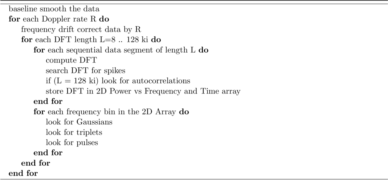 In the following sections, we describe the algorithm for each detection type, including how its thresholds and probability scores are computed. The algorithms operate on frequency-domain data computed as follows (see Section 5). The client uses coherent integration at a wide range of Doppler drift rates and uses a range of channel widths (or DFT lengths). At each combination of Doppler drift rate and DFT length, the client computes a sequence of DFTs on the de-drifted time-domain data. This produces, for each frequency channel, a power-versus-time (PvT) array.