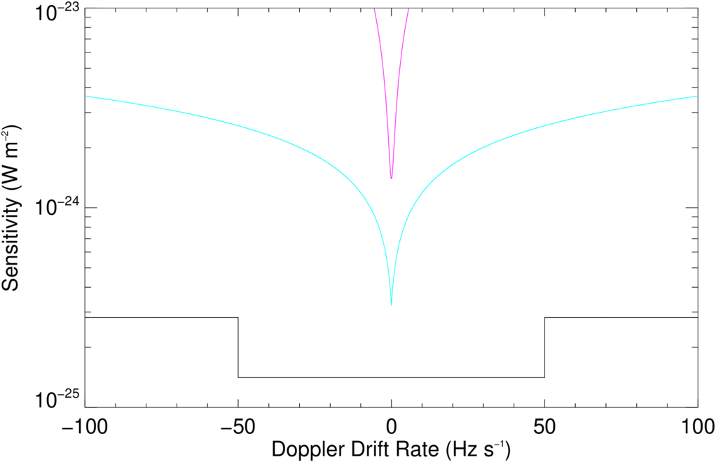 Coherent integration at a wide range of Doppler drift rates: SETI@home was the first project to use coherent integration, increasing its sensitivity to narrowband signals. SETI@home used coherent integration at 123,000 drift rates from −100 to 100 Hz s−1 to compensate for transmitter acceleration at a range of possible planetary or orbital parameters. Recently, other projects have used coherent integration, but only to compensate for receiver acceleration due to the Earth’s motion (P. Horowitz & C. Sagan 1993; J.-L. Margot et al. 2023).