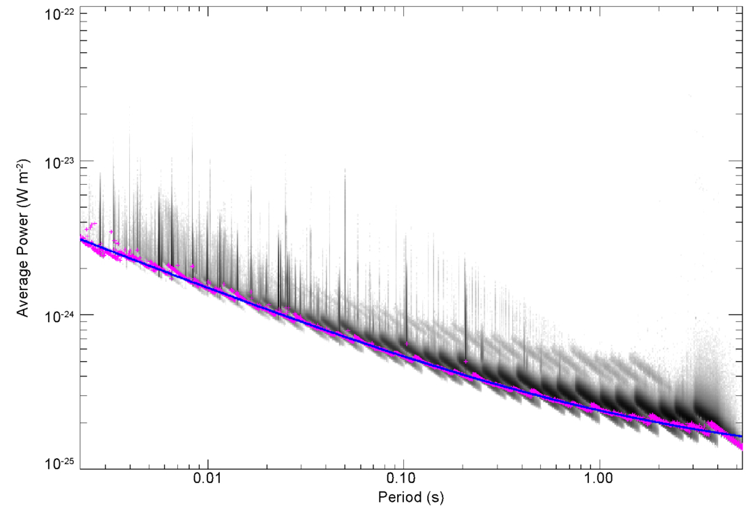 Figure 5. Average power vs. pulse period for 140 million pulses detected by SETI@home at times the telescope beam was moving within 5% of the sidereal rate. The magenta points mark the 5th percentile, which provides an estimate of sensitivity to pulses of that period. The blue line is a fit to those points, as described in Section 5.3.4.