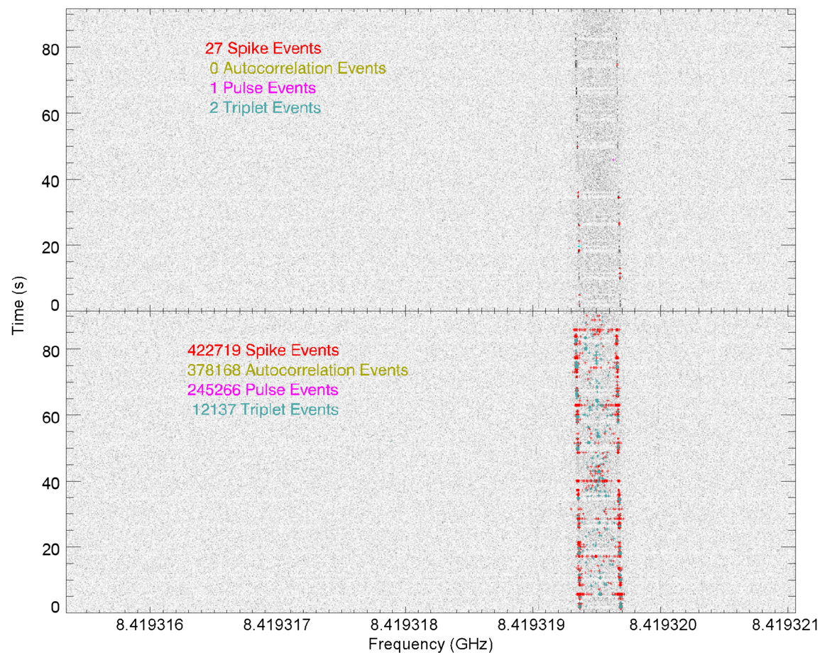 These results are shown in Figure 6. The upper and lower frames show the same grayscale image of power versus frequency and time generated using sequential DFTs of the workunit data. The frequency modulated data channel is visible on the right side. Detections are displayed using color coding, with spikes in red and triplets in cyan. Because the telescope is tracking, no Gaussian search is performed. Pulses and autocorrelation are not shown in this plot. The full duration of the workunit is folded; hence, all pulses have the same time. Because autocorrelations use the entire bandwidth of the workunit, their frequency is the midpoint of the band corrected for Doppler drift. The upper panel shows the result with the default SETI@home parameters, aborting after 30 detections are found. The lower panel shows the result if the analysis is allowed to run to completion: 1,058,290 detections throughout the time range in four detection types.
