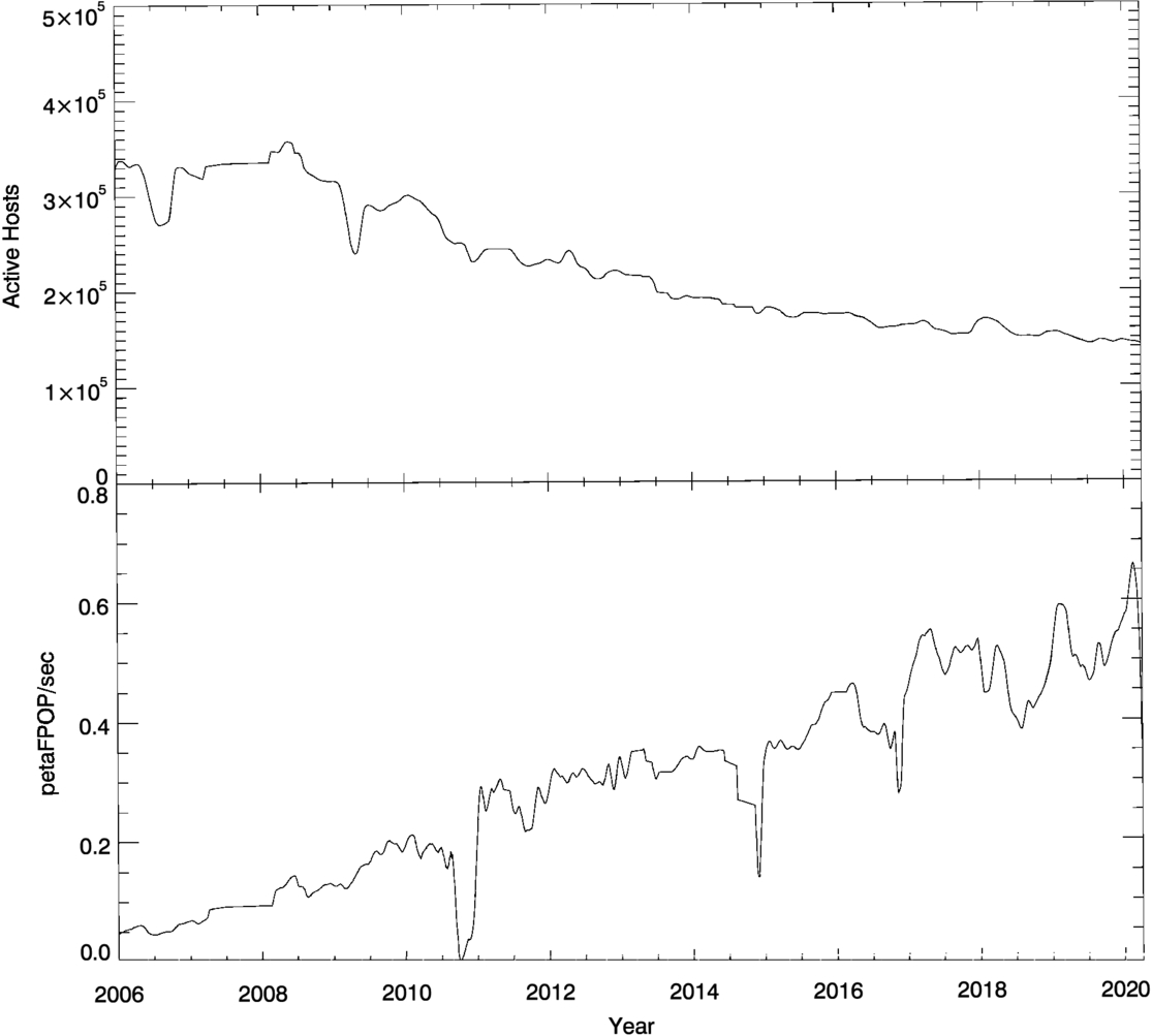 The computing throughput of SETI@home varied over time, as shown in Figure 7. This variation is due to several factors. Between 2006 and 2020, the number of computers actively participating decreased from 350,000 to 140,000. However, the average floating-point performance of the computers grew at a greater rate, due to increases in CPU clock rate and number of processors and (starting in about 2010) the introduction of GPUs capable of general-purpose floating-point computing at speeds 1 or 2 orders of magnitude faster than CPUs. Thus, the computing throughput grew from about 100 teraFPOP s–1 in 2006 to 600 teraFPOP s–1 in 2020. In total, SETI@home used roughly 6×1023 floating-point operations.