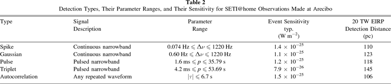 Table 2. Detection Types, Their Parameter Ranges, and Their Sensitivity for SETI@home Observations Made at Arecibo