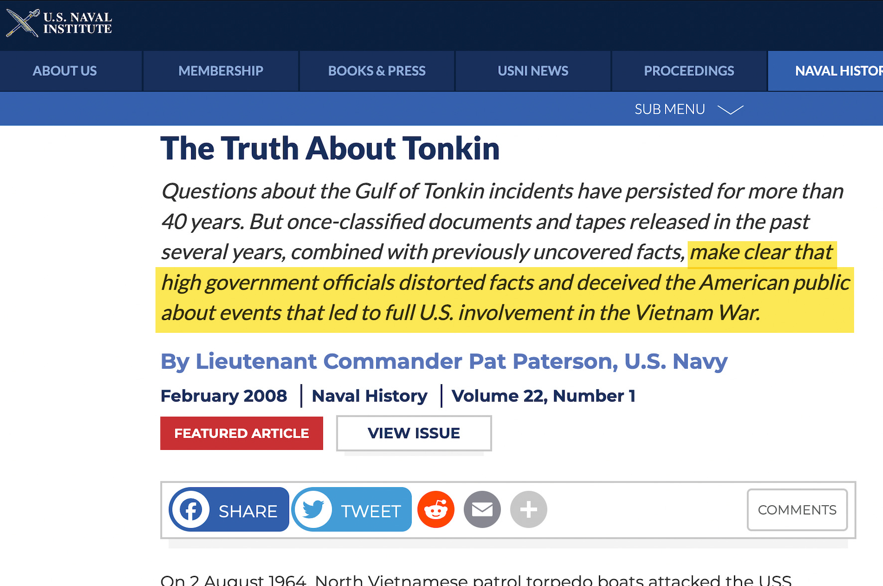 And, of course, the U.S. — despite fighting for more than a decade, with 58,000 Americans dead and countless more permanently wounded and scarred — lost the war. Daniel Ellsberg’s leak of the Pentagon Papers proved that the U.S. Government was systematically lying to the public for years about the prospects of victory. And, perhaps worst of all, it was ultimately revealed that the stated 1964 casus belli for the war — that the North Vietnamese had attacked American ships in the Gulf of Tonkin — was a complete fabrication, as even the U.S. Naval Institute now documents.