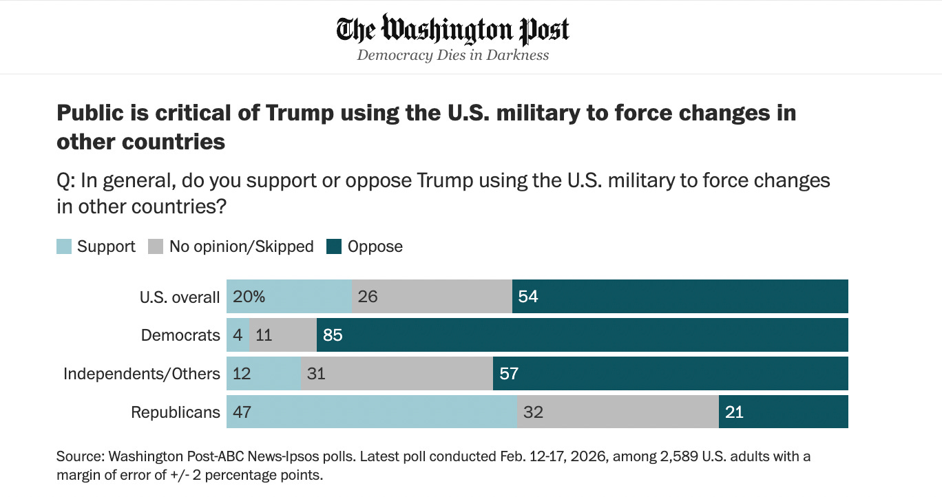 Polls overwhelmingly show that Americans view virtually every one of these past American debacles as a horrific error. Americans have been making it crystal clear for years now that they do not want more regime-change wars, endless wars, or having the U.S. act as the world’s police. The promise to end such wars was as central to Trump’s electoral victory as any promise other than perhaps his immigration policies. And, consistent with all of that, polls now show an overwhelming majority of Americans in steadfast opposition to new regime-change wars of the kind many are pushing for in Iran:
