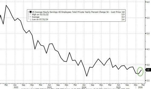 Turning to wages, average hourly earnings rose 0.4% MoM, same as January and above estimates of a 0.3% imcrease. This translated into a 3.8% YoY increase, up from 3.7% and the consensus of an unchanged print.