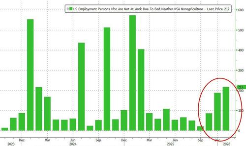 One potential mitigating factor: the number of people who were unable to work due to weather surged to 228K in February, well above last year's level 167K, due to the powerful winter storms hitting the US.