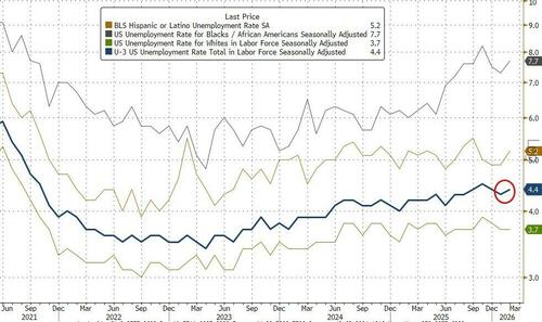 The unemployment rate rose from 4.3% to 4.4% vs estimates of an unchanged print, as the number of unemployed workers rose by 203K from 7.368MM to 7.571MM, while the civilian labor force was virtually unchanged (from 170.564K to 170.483K). Among the major worker groups, the unemployment rates for adult men (4.0 percent), adult women (4.1 percent), teenagers (14.9 percent), and people who are White (3.7 percent), Black (7.7 percent), Asian (4.8 percent), or Hispanic (5.2 percent) all rose modestly in February.