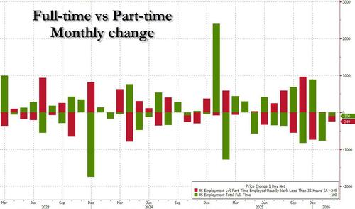 Looking under the surface does not reveal as silver lining: part-time workers dropped by 249K while full-time workers slid by 100K.