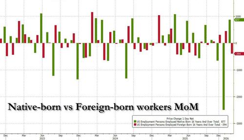 Perhaps the only silver lining was that native-born workers jumped by 877K (which was only a modest reversal of the 2.5 million drop last month), while foreign born workers dropped by 394K.