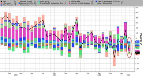 In our nonfarm payrolls preview, we quoted JPMorgan's Market Intel desk which said that "for this print, the stronger the better", which by implication means that a poor number would be bad. By that logic, the actual number couldn't be any worse, because moments ago the BLS reported that in February, the US lost 92,000 jobs, a huge drop from the downward revised (of course) 126K in January, and the second worst print since 2020 (only October's shock -140K was worse). The number of private payrolls dropped by 86K, also a huge miss to estimates of a 60K increase.