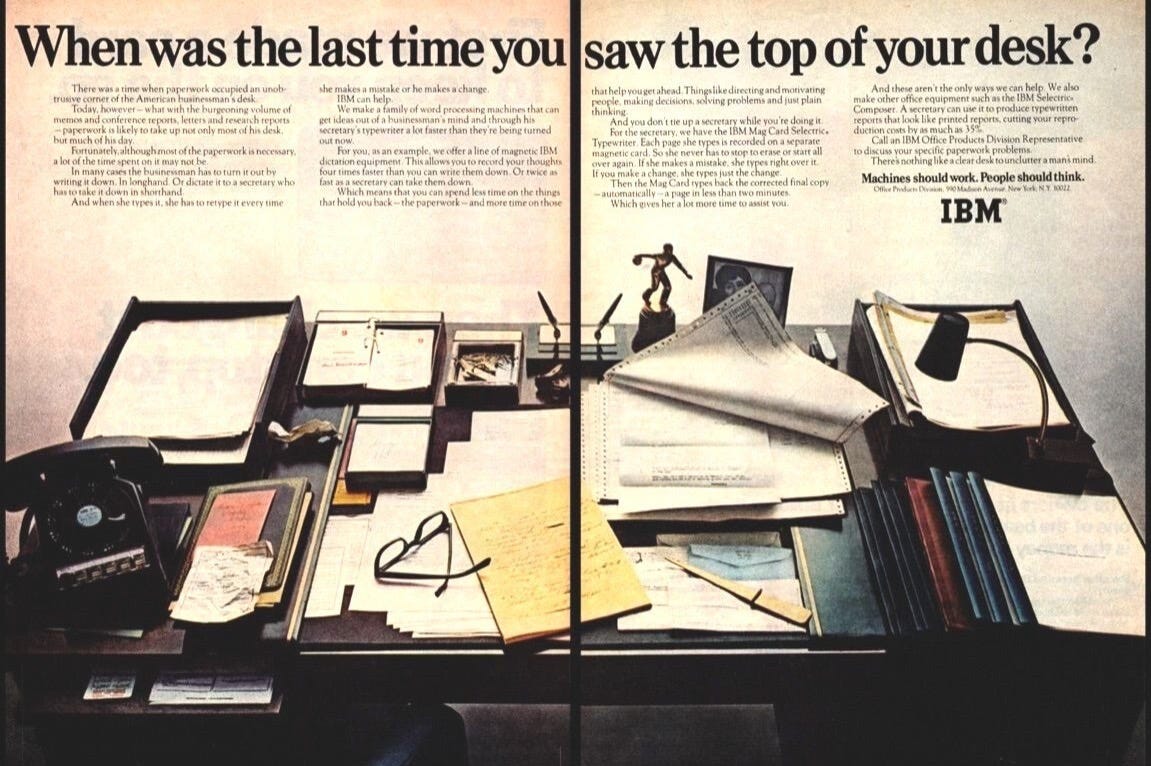 Why so many? Because every stage of information processing required a human hand. In a mid-century organisation, a manager did not “write” a memo. He dictated it. A secretary took it down in shorthand, then retyped it. Then made copies. Then collated the copies by hand. Then distributed them. Then filed them. And so on and so on. Nothing moved unless someone physically moved it. There was no other way.