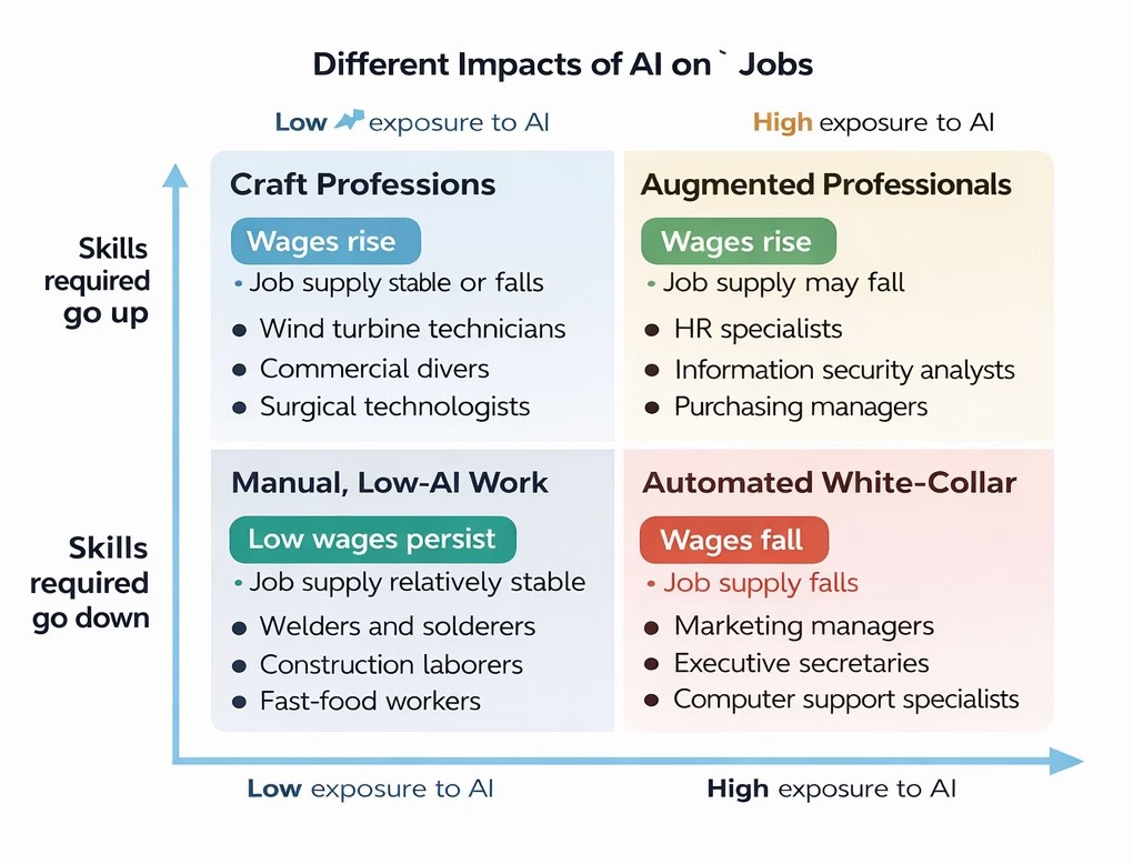 Early evidence suggests that this same dynamic is playing out again with AI. A recent paper by Bouke Klein Teeselink and Daniel Carey using data on hundreds of millions of job postings from 39 countries found that “occupations where automation raises expertise requirements see higher advertised salaries, whereas those where automation lowers expertise do not.”
