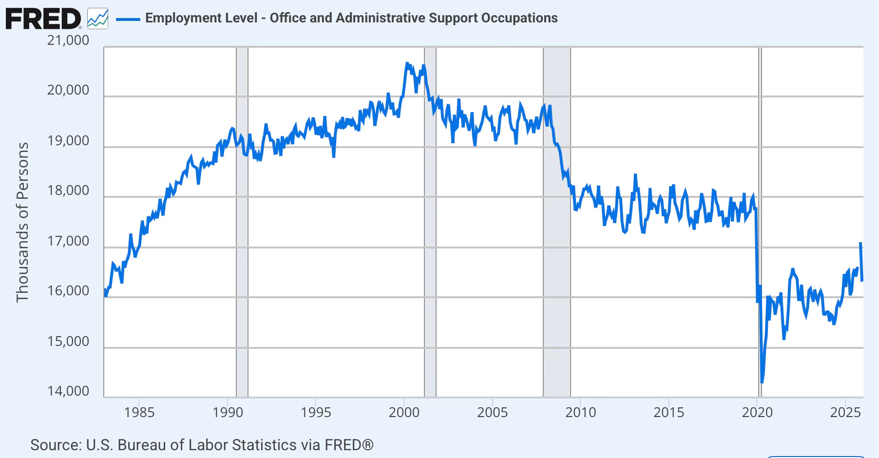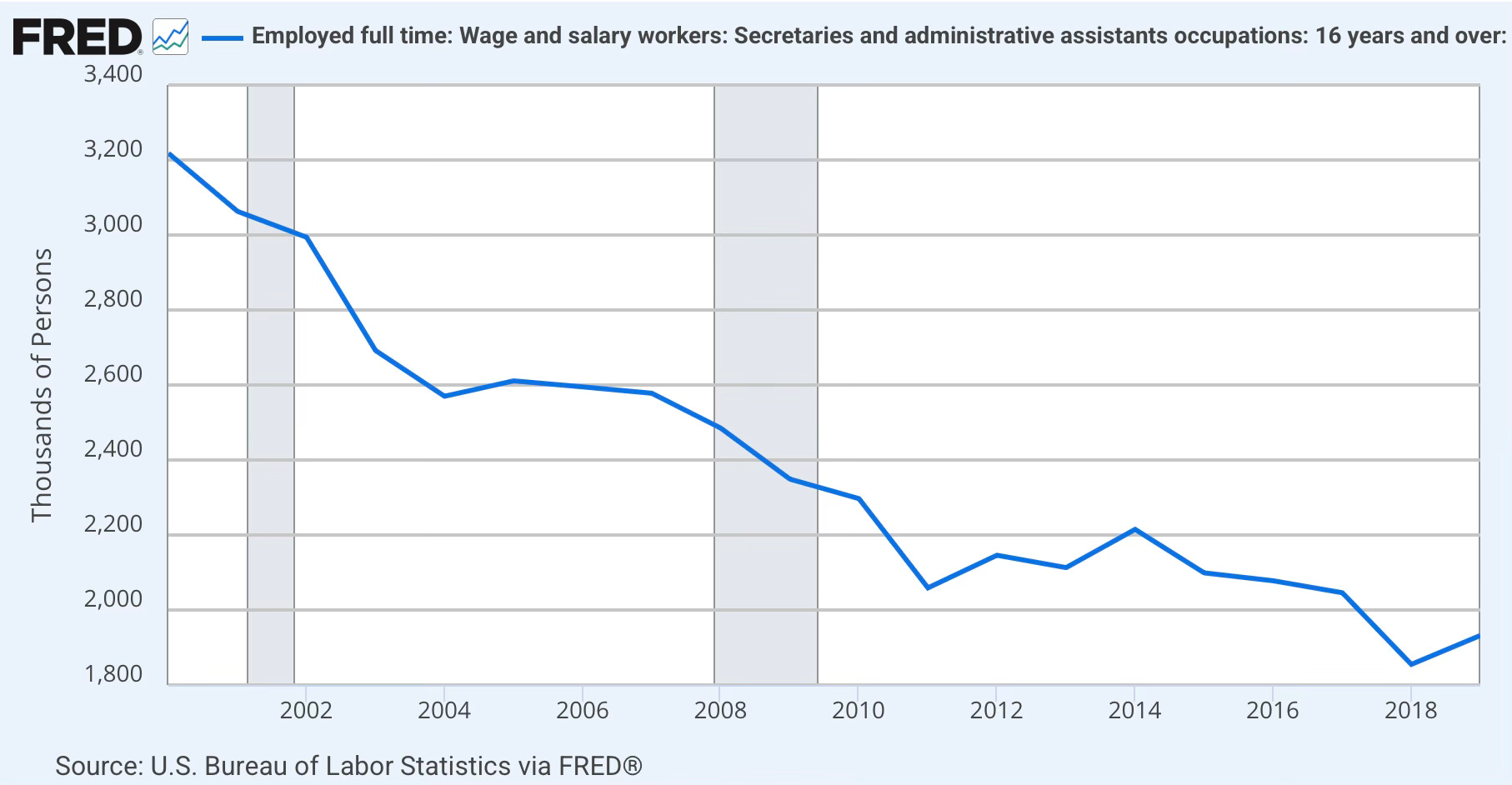 Yes: according to the Bureau of Labor Statistics, there are still around 45,000 people in the United States whose primary occupation is typist or word processor. That’s only 0.025 percent of the workforce, down from 250,000 at the turn of the millennium, but still – they exist. Technological displacement takes a long time to produce literal extinction. An obvious point, but an important one.