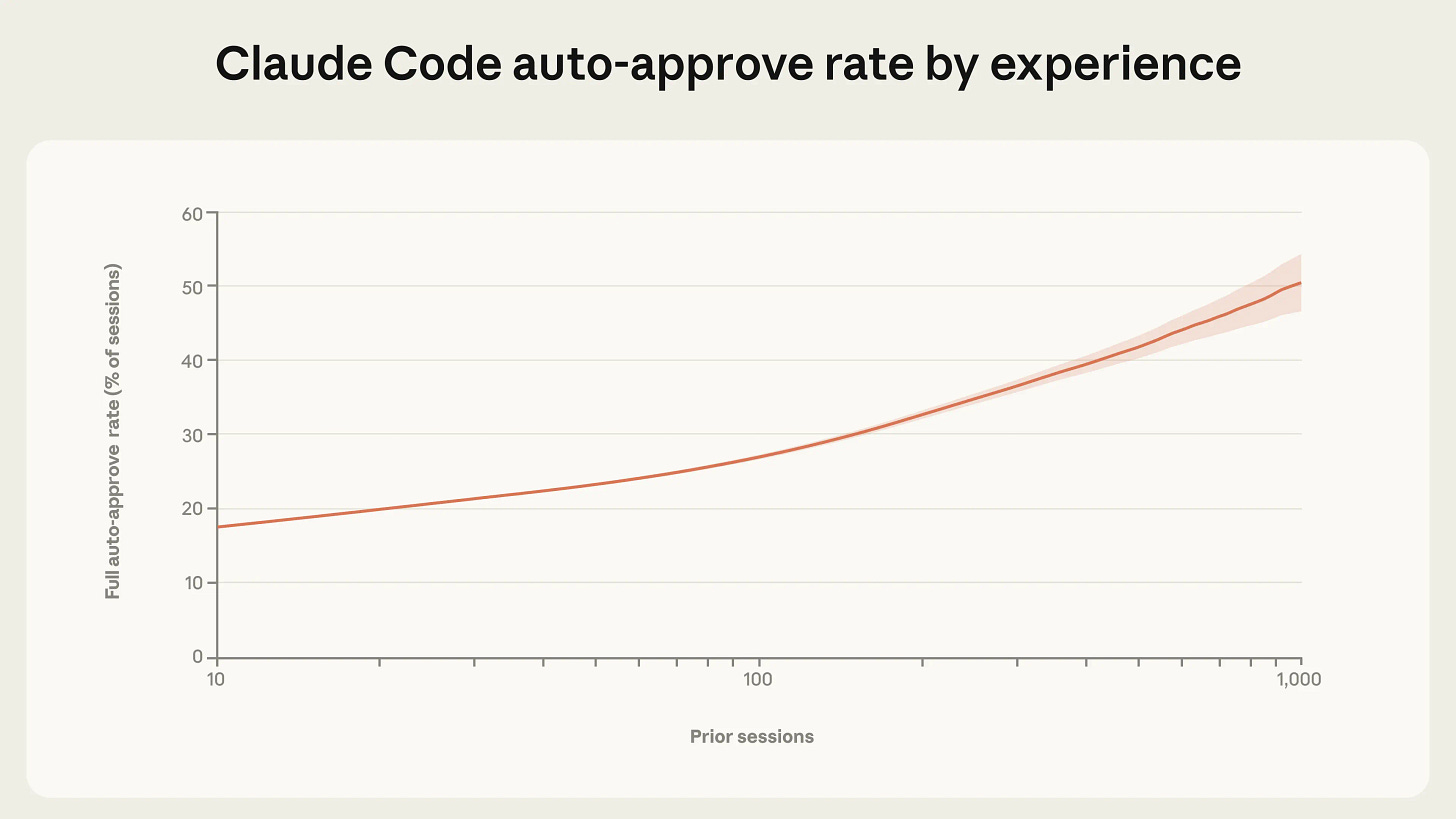 Anthropic: Experienced users in Claude Code auto-approve more frequently, but interrupt more often. As users gain experience with Claude Code, they tend to stop reviewing each action and instead let Claude run autonomously, intervening only when needed. Among new users, roughly 20% of sessions use full auto-approve, which increases to over 40% as users gain experience.