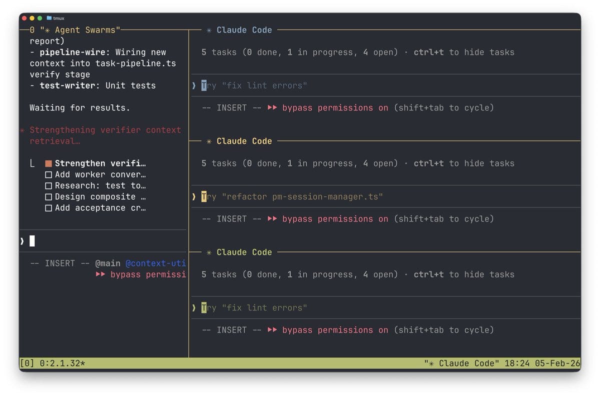 Eric Buess: Agent swarms in Claude Code 2.1.32 with Opus 4.6 are very very very good. And with tmux auto-opening each agent in it’s own interactive mode with graceful shutdown when done it’s a breeze to do massive robust changes without the main agent using up much of its context window!