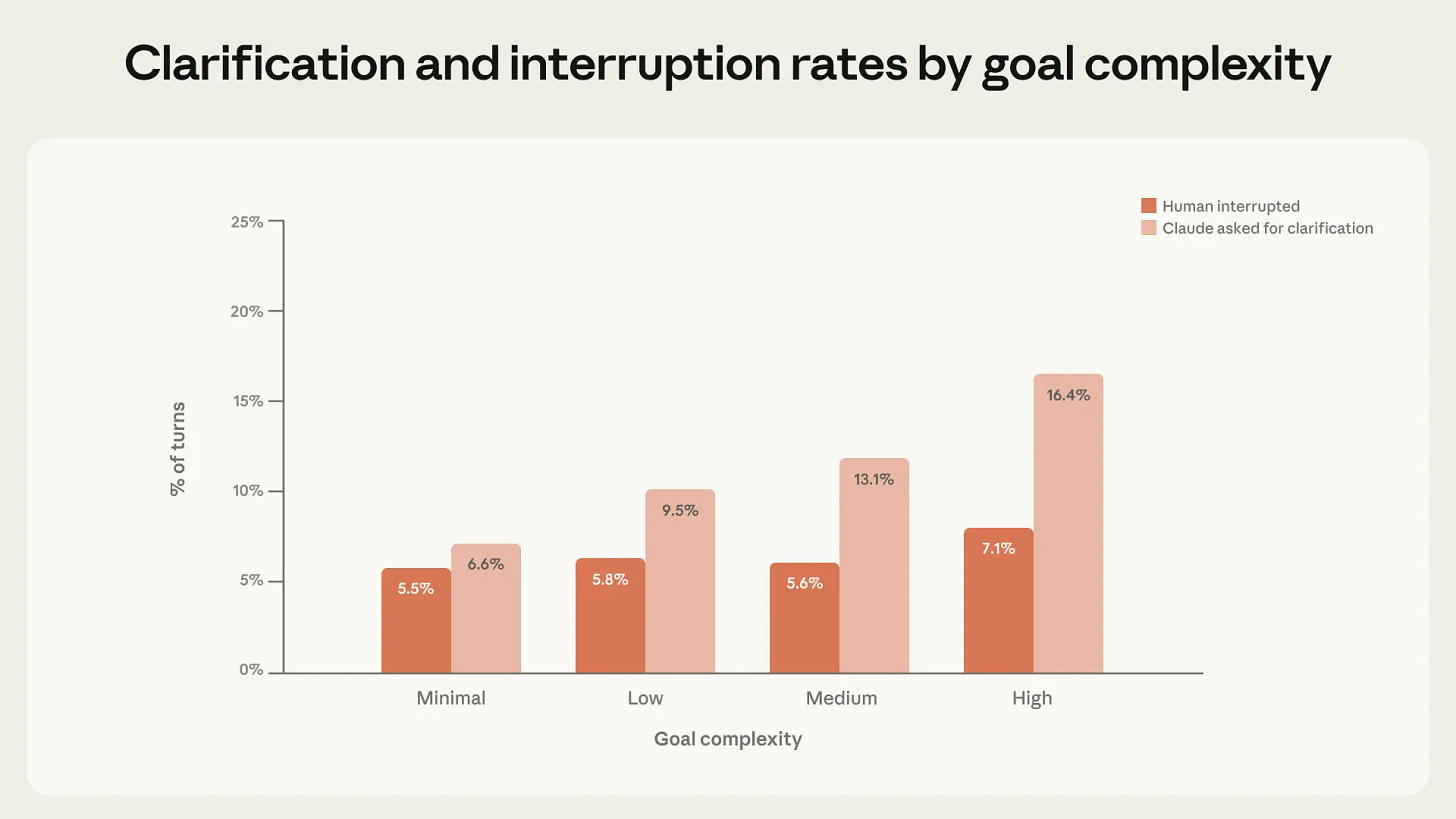 Manually approving each action is annoying, so it’s no surprise advanced users stop doing that. Interruption rate likely depends on whether you find it worthwhile to be looking at what Claude is doing. The majority of interruptions remain pauses for clarification, including on complex tasks.
