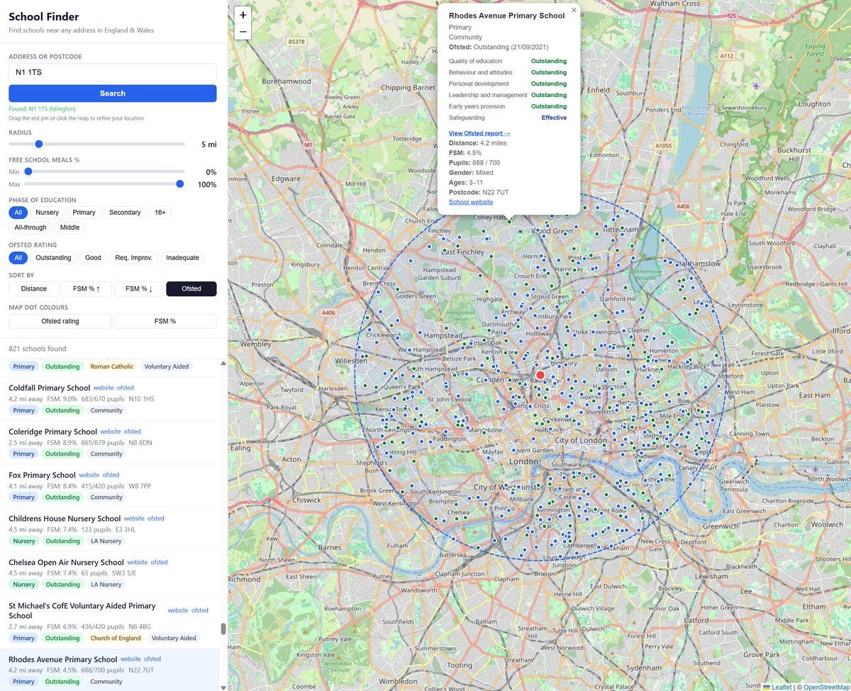 Filter and rank by the old one-word Ofsted ratings, with a link to the Ofsted page for each school. Where available, the sub-ratings are also viewable.