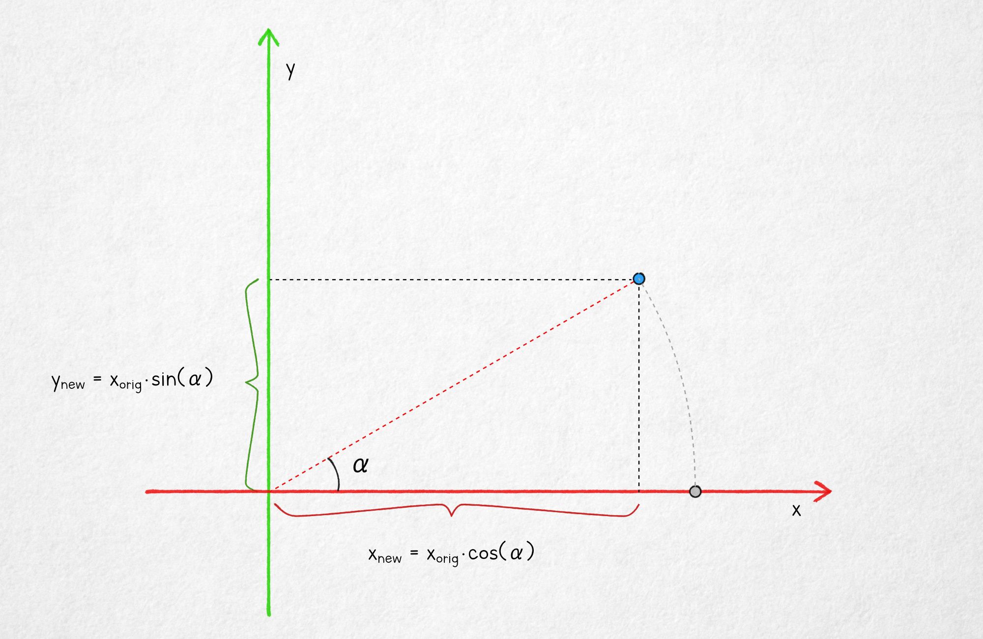 From basic trigonometry, the new x coordinate of the rotated point is the adjacent of a right triangle with an angle α and a hypotenuse of xorig. The new y is the opposite of that same triangle. If we want to start with a non-zero y coordinate for the point, we need add a small tweak: