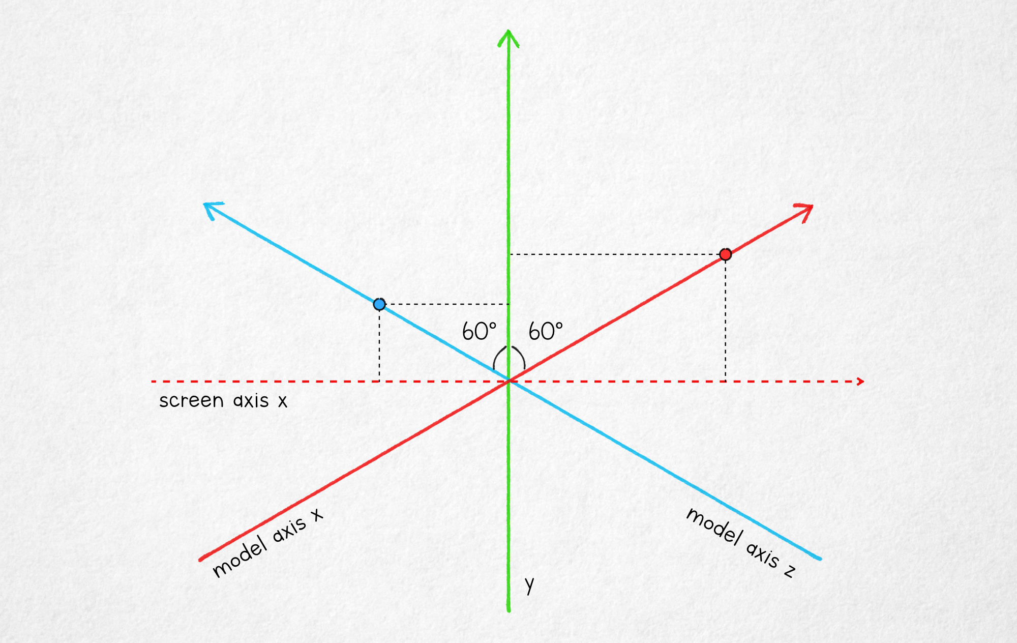 The math for this projection is still simple. The screen x coordinate is dictated by model x multiplied by cos(30°) — that’s the angle between the model x axis and the real one. The value is also influenced in the same way but with an opposite sign by the model z axis, so we get: