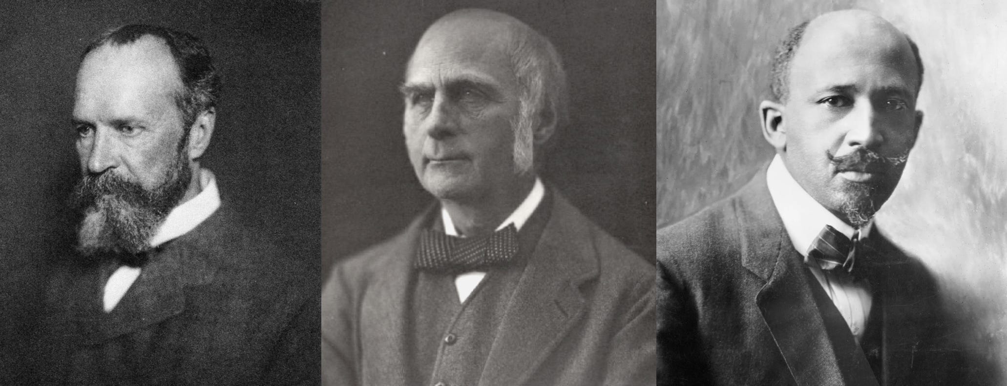 Francis Galton (center) was a sort of intellectual frenemy for James, initially a mentor and influence, then later — in his guise as a founder of eugenics and ardent imperialist — as an exemplar of the dangers of scientific hubris. Du Bois (pictured at right) studied with James at Harvard and was deeply influenced by his philosophy of pluralism.