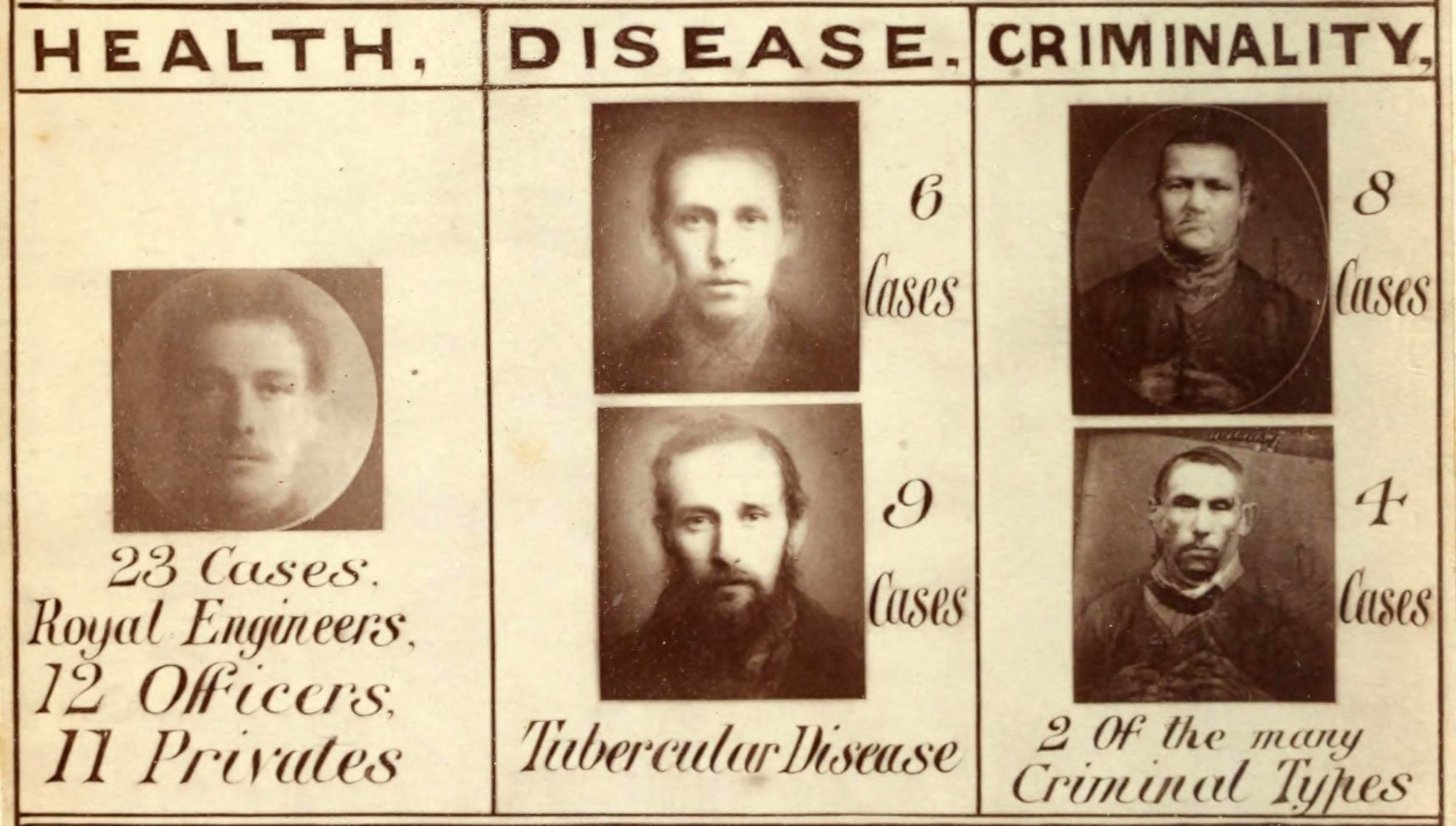 Galton, obsessed as he was by measurement and averages, took this in a novel and discomfiting direction. Elsewhere in the same book that the beautifully strange image above comes from, Galton introduced composite portraits — photographs of criminals, tubercular patients, “types” of any kind — layered individual faces on top of each other to produce a kind of statistical average in visual form.