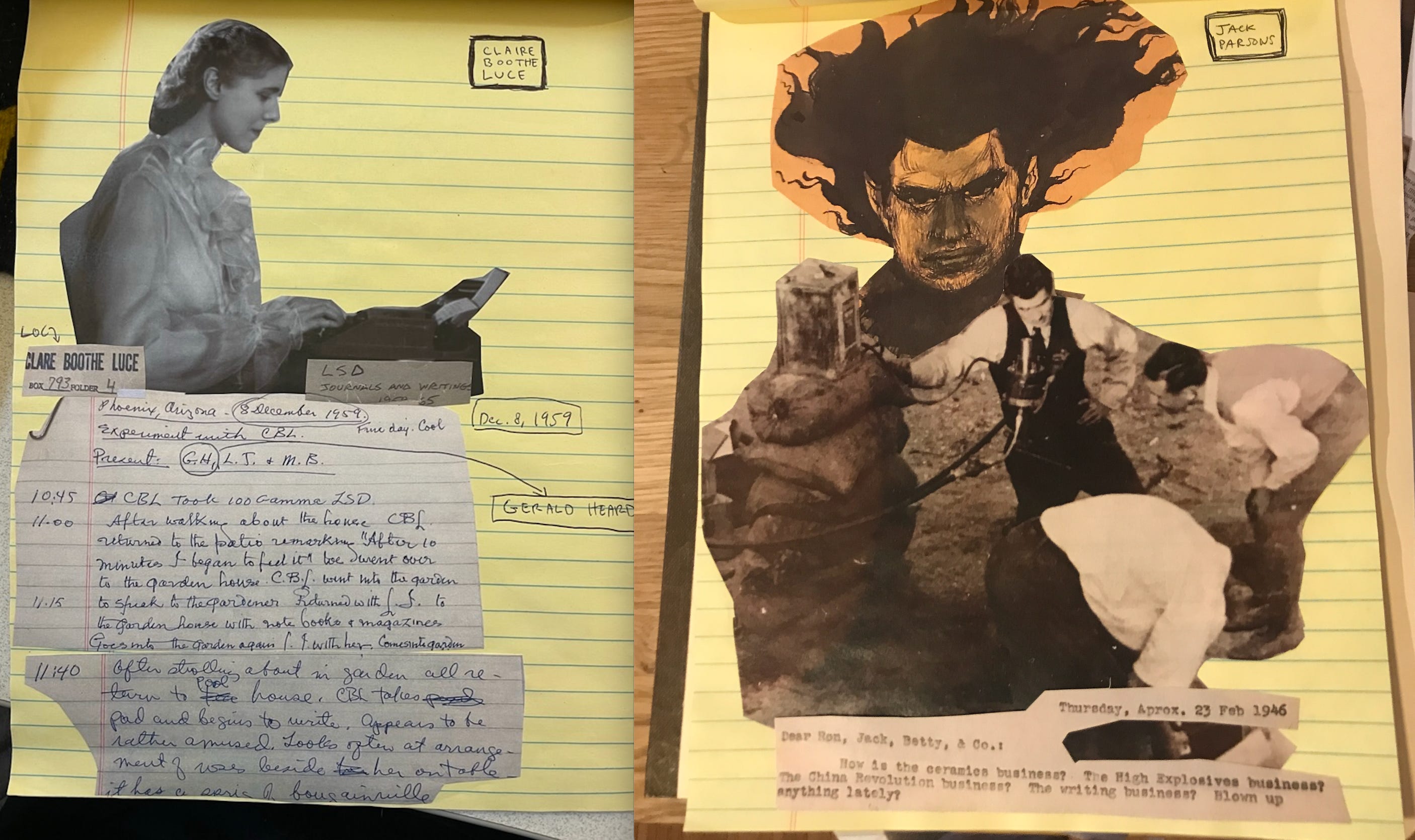 That link between the hand and mind is harder to come by in a world where all research is digital, but it can be fun and important to access when doing serious research. When I was deepest in researching the history of 20th century psychedelic science for Tripping on Utopia, I filled up a yellow notebook with collaged images and primary source snippets from my archival research. I started it as a sideline, almost a hobby to distract me from what I saw as the “real” work of actually writing the book.