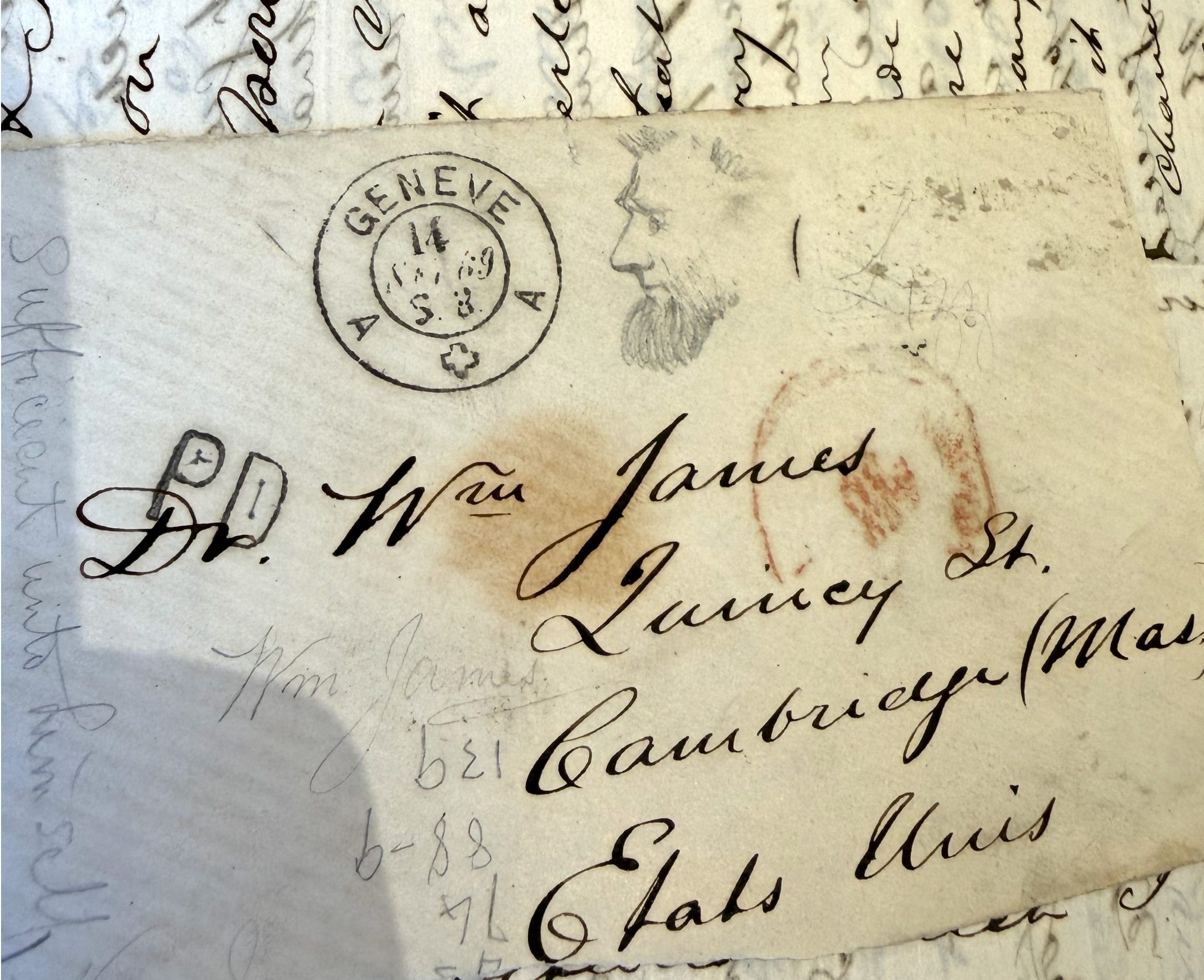 Here he is, for instance, doodling on an envelope addressed to him from Geneva: