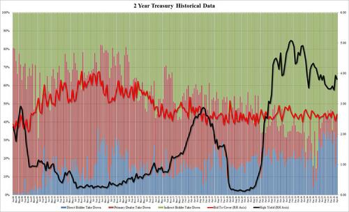 In today's first of two coupon auctions (due to the week's truncated schedule as the Fed is on Wednesday), the US Treasury sold $69BN in 2 year paper in a mediocre auction, yet one which was notably stronger than last month's issuance.