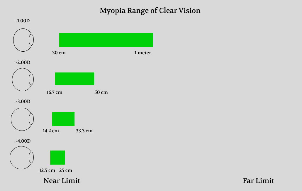 Think of it like clenching your fist whenever you look at a screen, tightly for computers and even tighter for smartphones. Clench your fist for 8 hours a day, every day. When you need to look at something far away, i.e. for driving, fully open your hand.