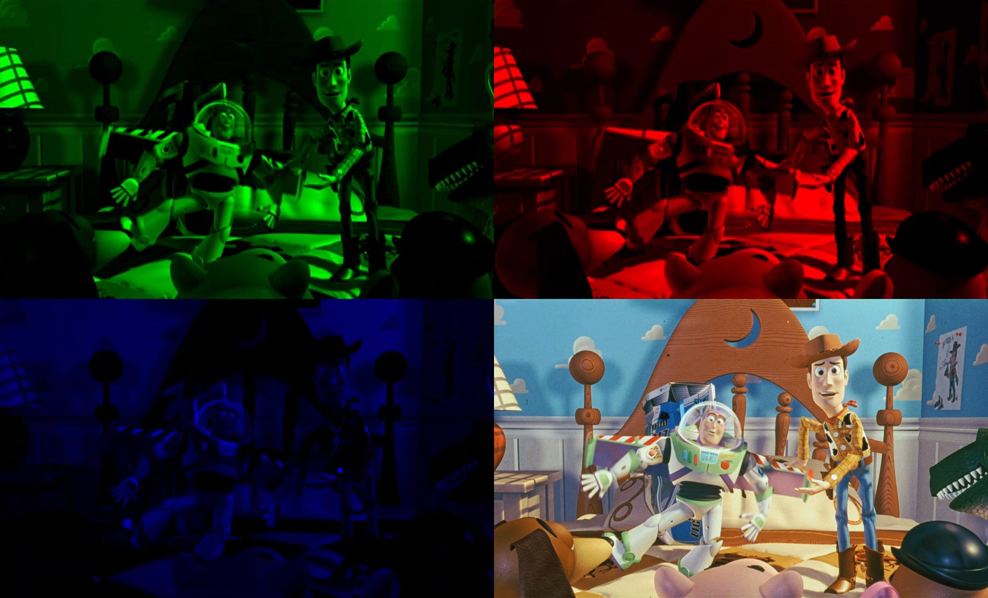 Their system was fairly straightforward. Every frame of Toy Story’s negative was exposed, three times, in front of a CRT screen that displayed the movie. “Since all film and video images are composed of combinations of red, green and blue light, the frame is separated into its discrete red, green and blue elements,” noted the studio. Exposures, filtered through each color, were layered to create each frame.