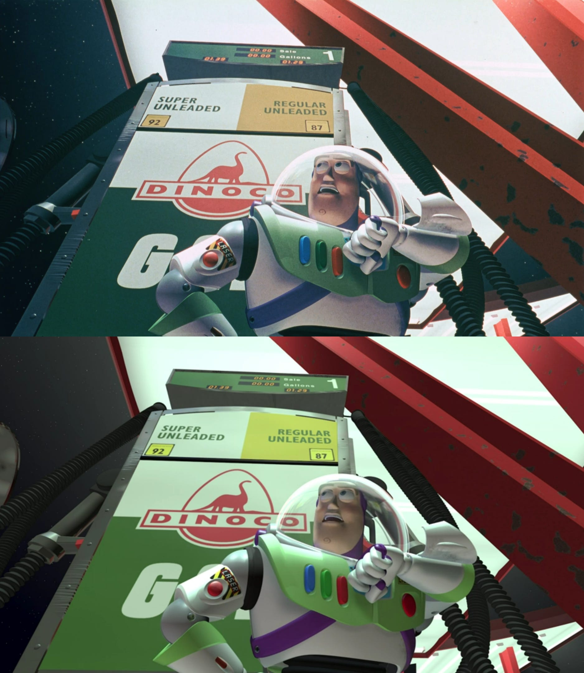 Toy Story was a transitional project. Since Pixar couldn’t send digital data to theaters, every one of the movie’s frames was printed on analog film. When Toy Story originally hit home video, that 35 mm version was its source. Only years later, after technology advanced, did Pixar start doing digital transfers — cutting out the middleman. And Toy Story’s look changed with the era.