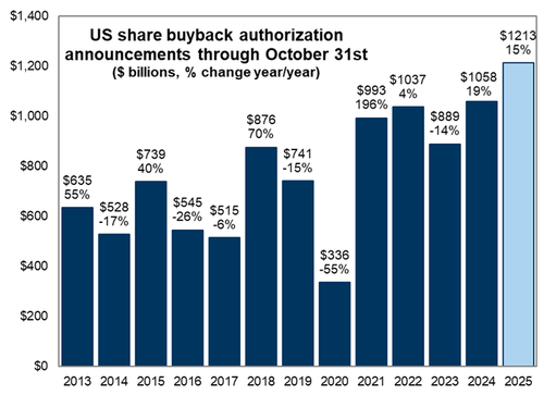 Additionally, Goldman yesterday noted that corporate buybacks are also providing a tailwind to equities now that the earnings season is over. US companies had authorized over $1.2 trillion of buybacks this year through October, an increase of 15% from last year, according to Goldman Sachs research — and November is typically one of the strongest months for buybacks.