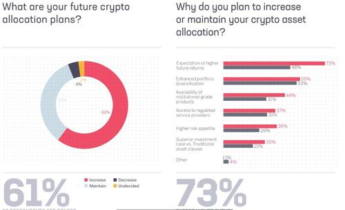 Over 61% of institutions plan to increase their cryptocurrency investments, while 55% hold a bullish short-term outlook, Swiss crypto banking group Sygnum said in a report released on Tuesday.
