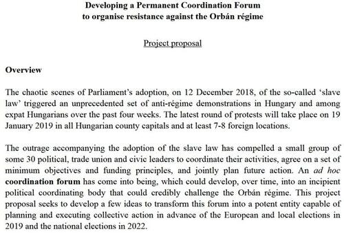 According to Benedek, outrage over what he referred to as “the slave law” had “compelled a small group of some 30 political, trade union and civic leaders to coordinate their activities, agree on a set of minimum objectives and funding principles, and jointly plan future action.” This had given birth to “an ad hoc coordination forum… which could develop, over time, into an incipient political coordinating body that could credibly challenge” Orban’s rule.
