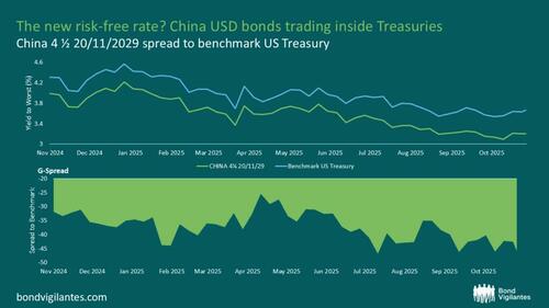 中国最近发行了40亿美元债券,需求巨大——最初的订单簿高达1610亿美元——并且定价与美国国债非常接近(价差为0-2个基点)。 令人惊讶的是,这些债券在发行后*增值*,交易价格比美国国债曲线低30多个基点,这种现象很少见,考虑到中国的A+信用评级。