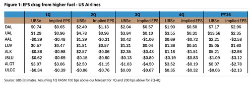 飙升的喷气燃料价格对美国航空公司构成重大威胁,瑞银分析师警告称,航空公司利润将普遍下降。值得注意的是,大多数美国航空公司“几乎没有对冲”燃料成本超过每加仑4美元的风险,这使它们容易受到当前能源冲击的影响。