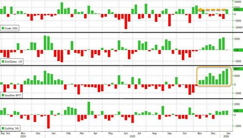 尽管伊朗地缘政治紧张局势推高了油价,但美国石油市场却意外地出现了库存增加。最新的能源部报告显示,原油库存大幅增加340万桶——为11月以来最高涨幅,汽油库存也大幅增加(接近900万桶,为2023年12月高点)。馏分油库存保持平稳。