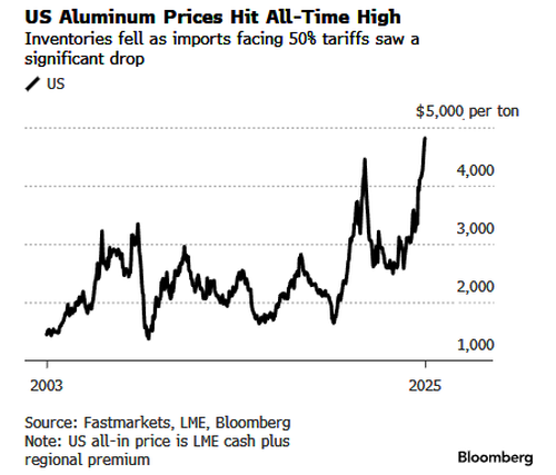 美国铝价在7月飙升至历史新高,达到每吨4816美元,几乎是2023年12月低点的两倍。 这一涨幅主要归因于特朗普政府的铝关税,旨在提振国内生产。 然而,美国仍然严重依赖进口,特别是来自加拿大的进口,自关税实施以来已显著减少并翻倍至50%。