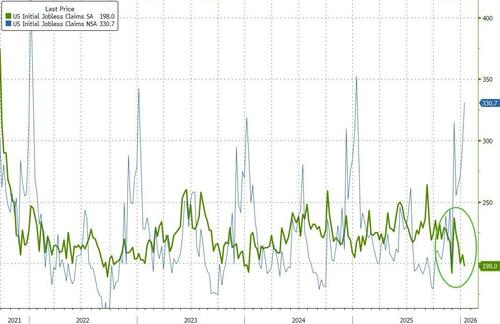 值得注意的是,未经季节性调整的数据大幅上升(33万),其季节性模式仍在持续。
