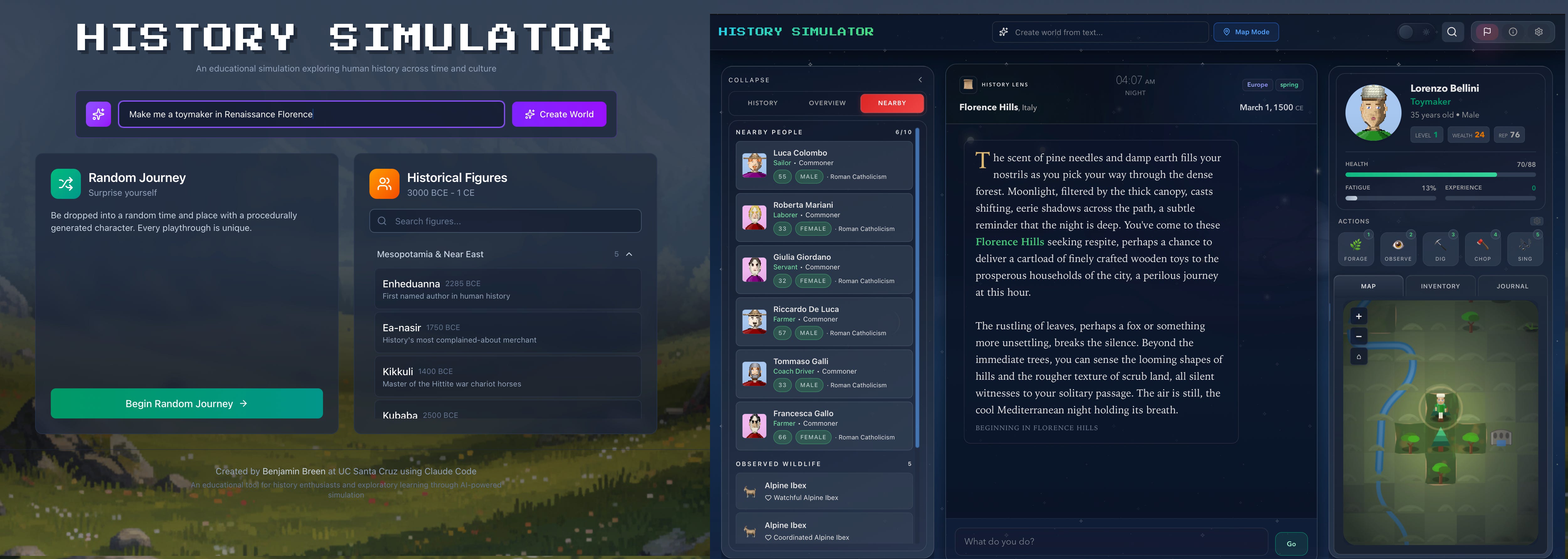 Drawing on my earlier work on historical simulation using ChatGPT prompts, I made a full-on history simulator (GitHub here) which randomly drops you in different historical eras and cultures, with pixel art graphics augmenting an LLM-generated narrative engine which is grounded in real primary sources and a rather elaborate system for generating at least somewhat accurate historical context.