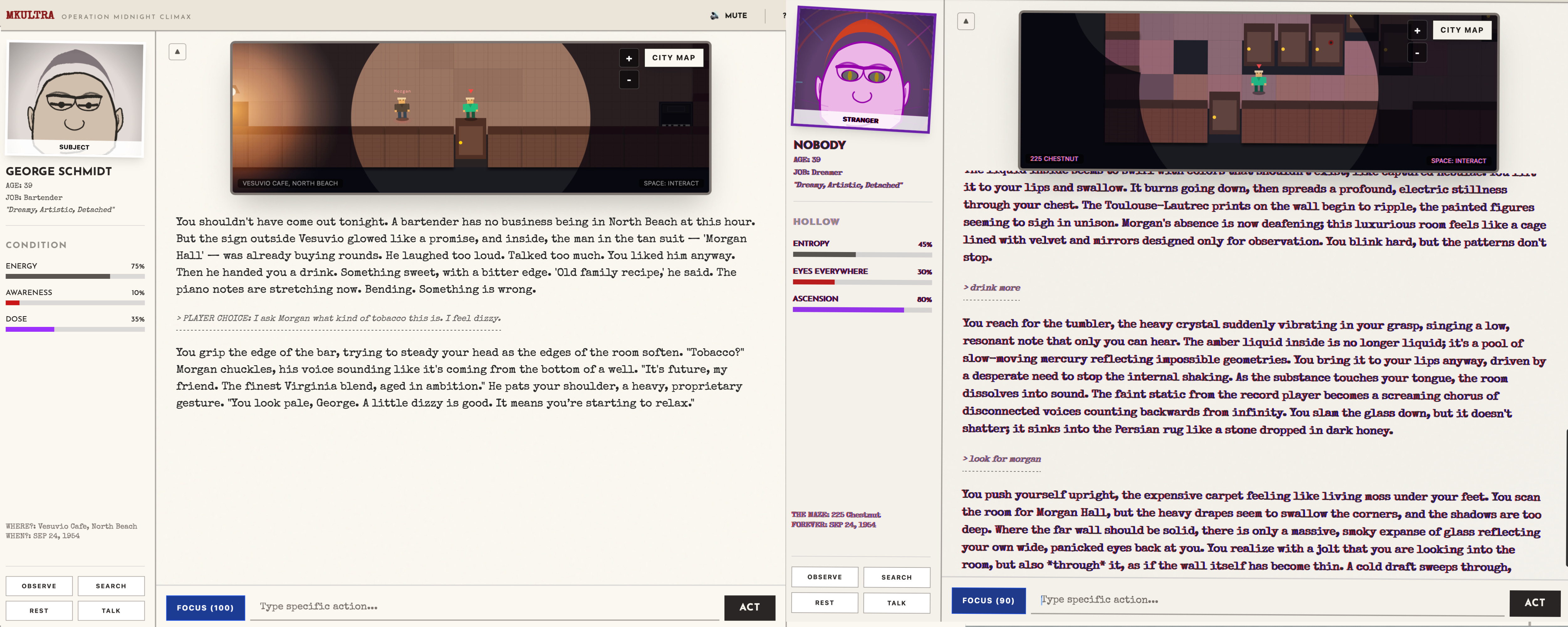 I tried to make a game called MKULTRA (playable version here, GitHub here). This game is based directly on primary sources relating to George Hunter White’s now-infamous CIA-funded work on dosing unwitting civilians with LSD which I had gathered for my book Tripping on Utopia. As with History Simulator, the text responding to player input here is generating by Google’s Gemini 2.5 model. The difference here is that it gets more and more outlandish and surreal as you, playing as a procedurally generated person in 1950s San Francisco, are dosed with psychedelics. As your “trippiness” meter increases, the UI itself begins to break down and change. Compare the relatively sober player view at left with the altered one at right: