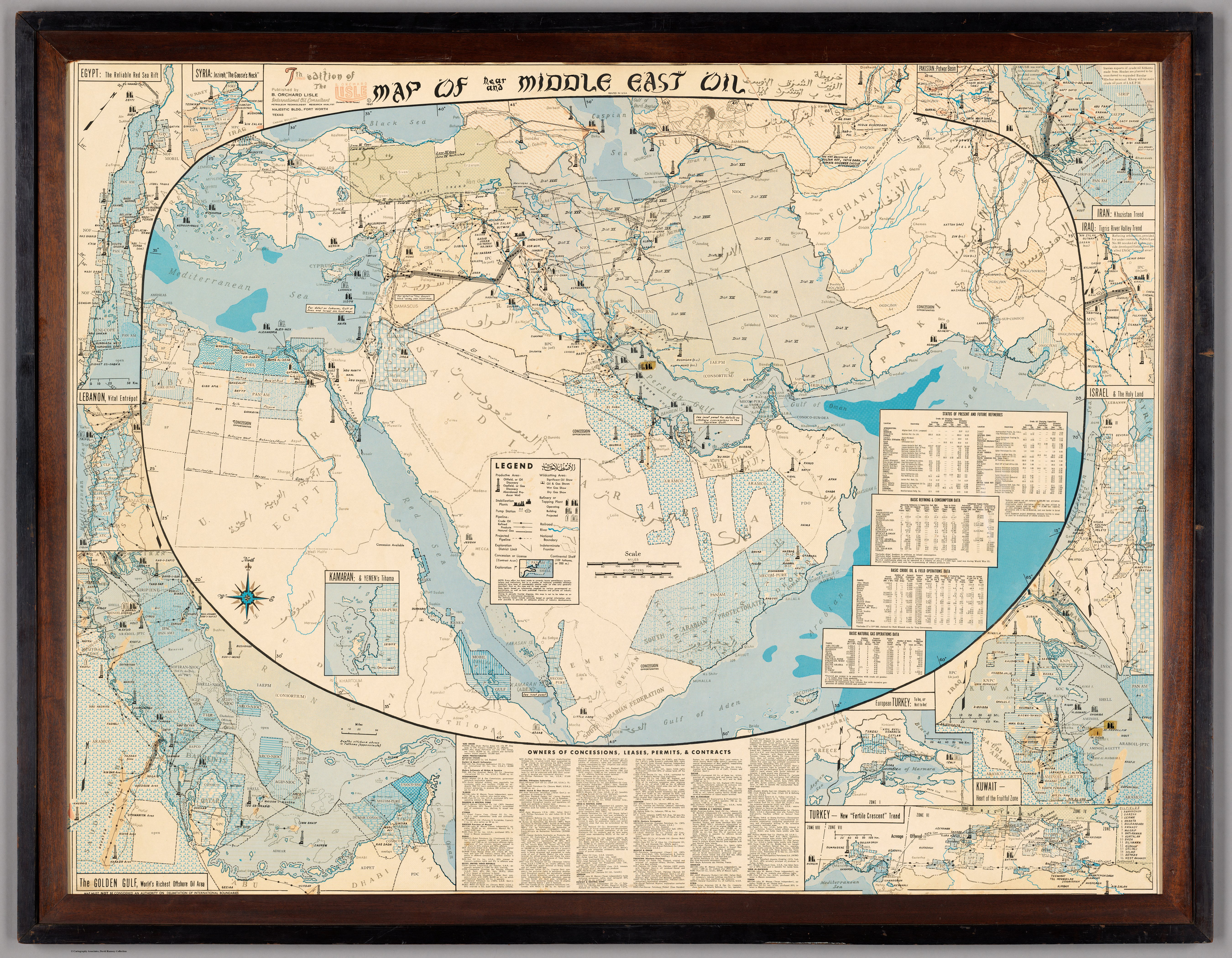 The map is a diagram of networks—pipelines, oilfields, terminals, company concessions, and shipping routes—depicting the Middle East’s oil as a vast, interdependent system. These networks are both physical (infrastructure) and abstract (ownership, contracts), making the map a powerful tool for understanding the strategic importance and international entanglement of oil in the mid-20th century. AI analysis.