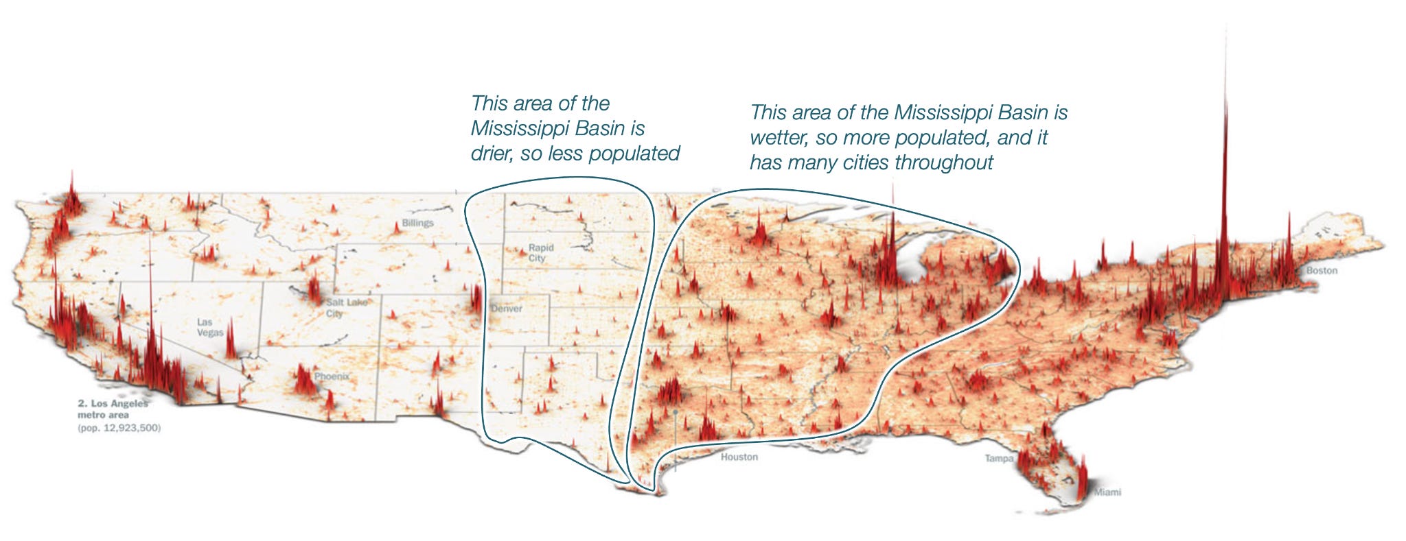 Since the entire Mississippi river basin is quite flat, it doubles up as an amazing irrigation field for crops and the perfect highway to bring produce to world markets, as it’s the biggest network of natural navigable waterways in the world.