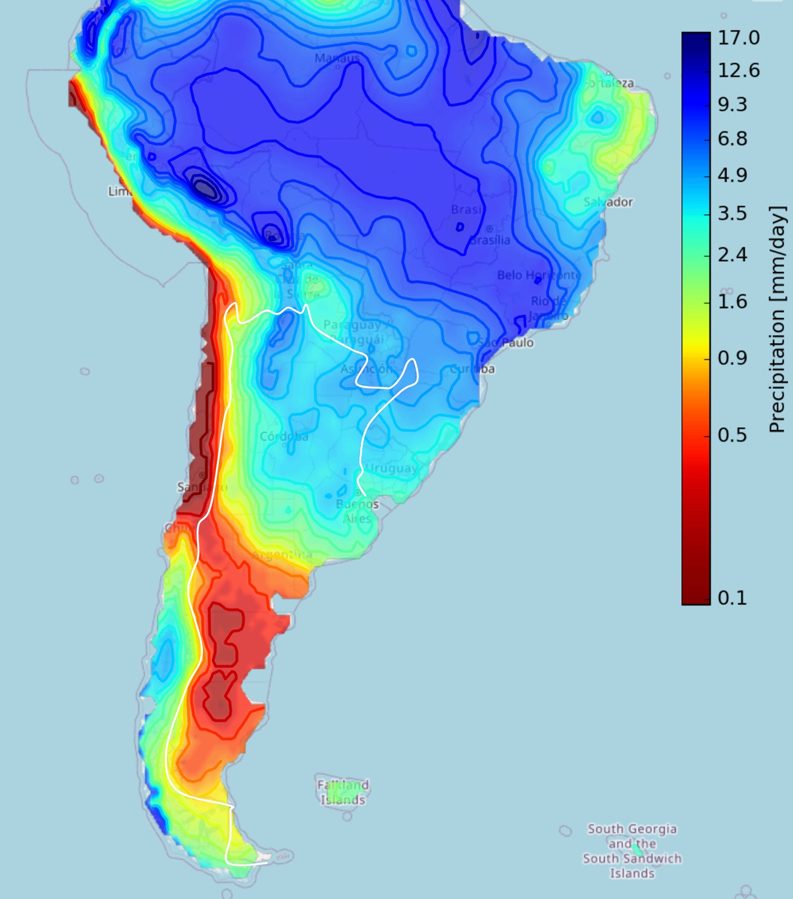 This makes the US West Coast, the Amazon, and southern Chile very wet. But these rains also affect the north of Argentina, feeding the Río de la Plata basin, and dropping tons of water on the eastern Andes: