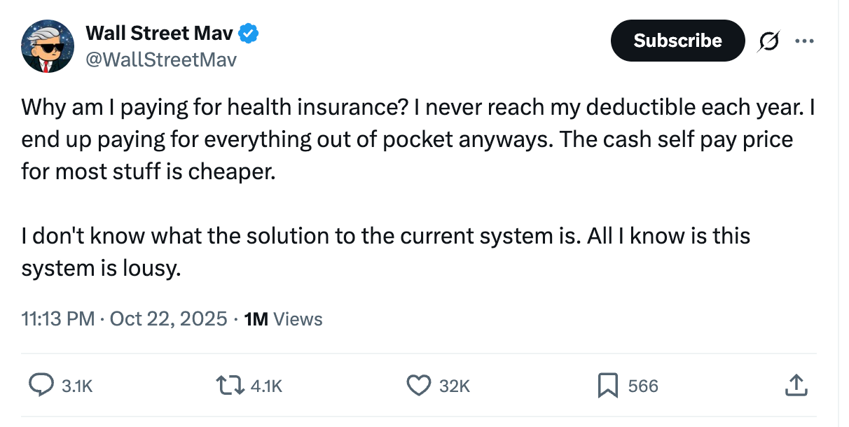 Insurance should protect against risk, not guarantee consumption through pre-payment. It seems like we’re getting to a breaking point where health insurance, as it currently works in the United States, is due for a major overhaul.